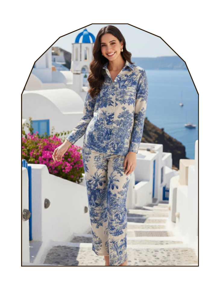 Sky Blue Floral Printed Co-Ord Set for Women | Cotton Shirt Collar Kurti & Pant Set