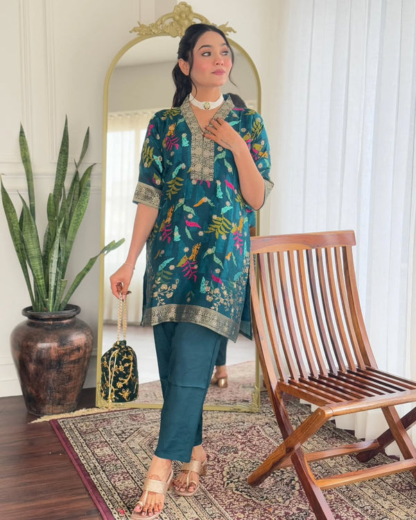 Teal Blue Embroidered Kurti Set with Dupatta | Premium Festive Wear