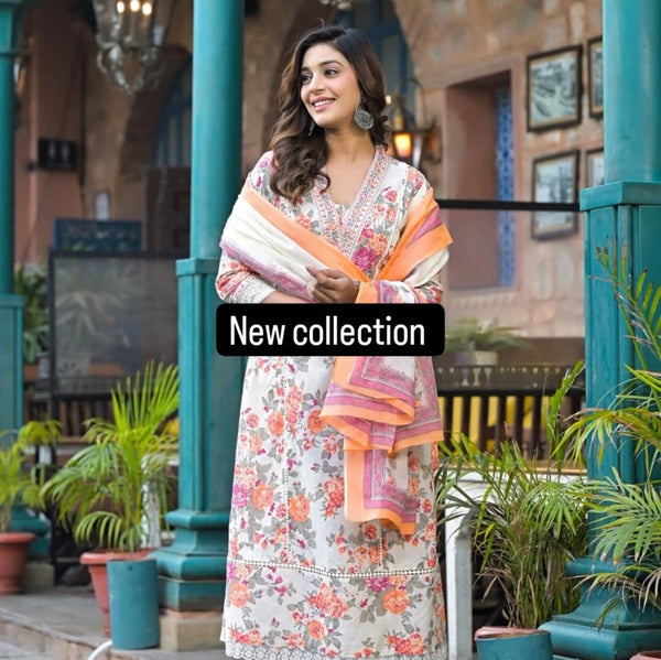 Elegant White Printed Muslin Kurta Set with Dupatta – 3 Piece Women Ethnic Wear