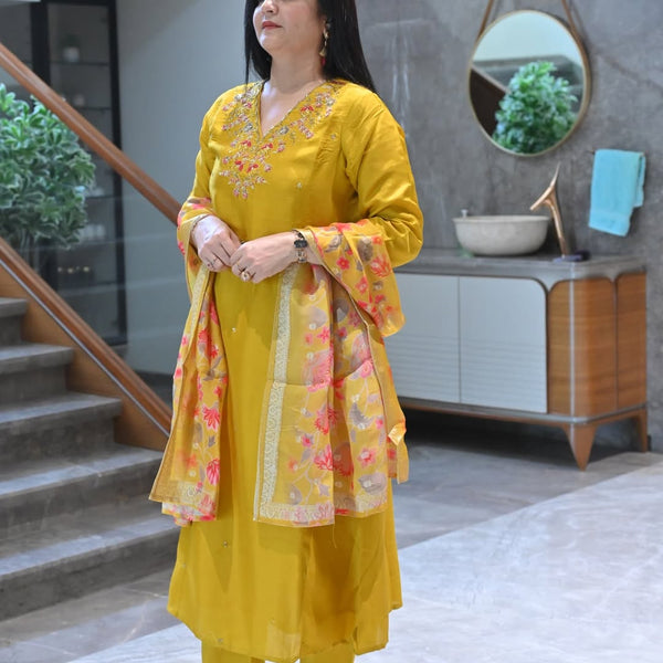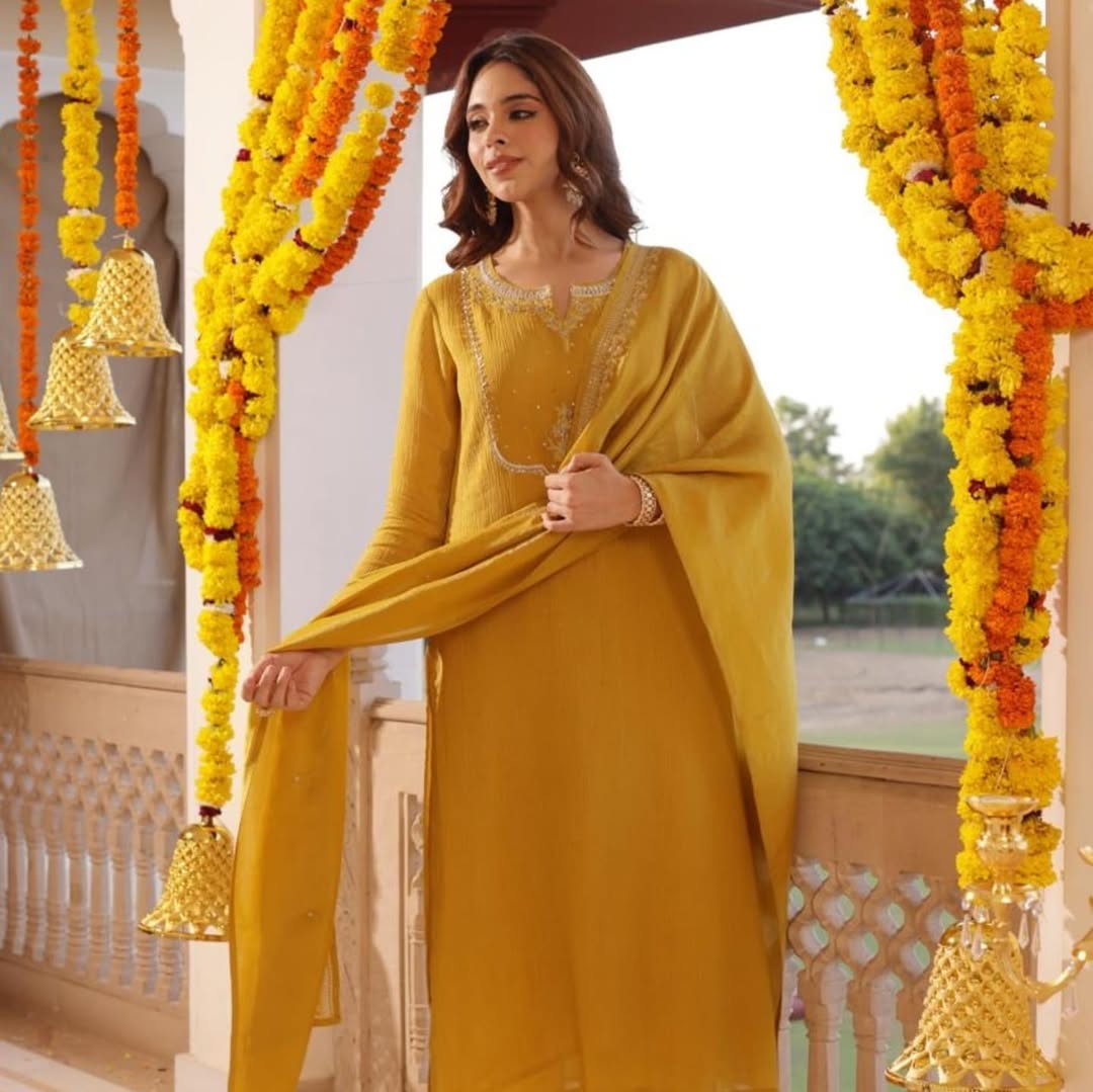 Mustard Yellow Embroidered Co-Ord Set for Women | Cotton Kurti Pant Set