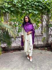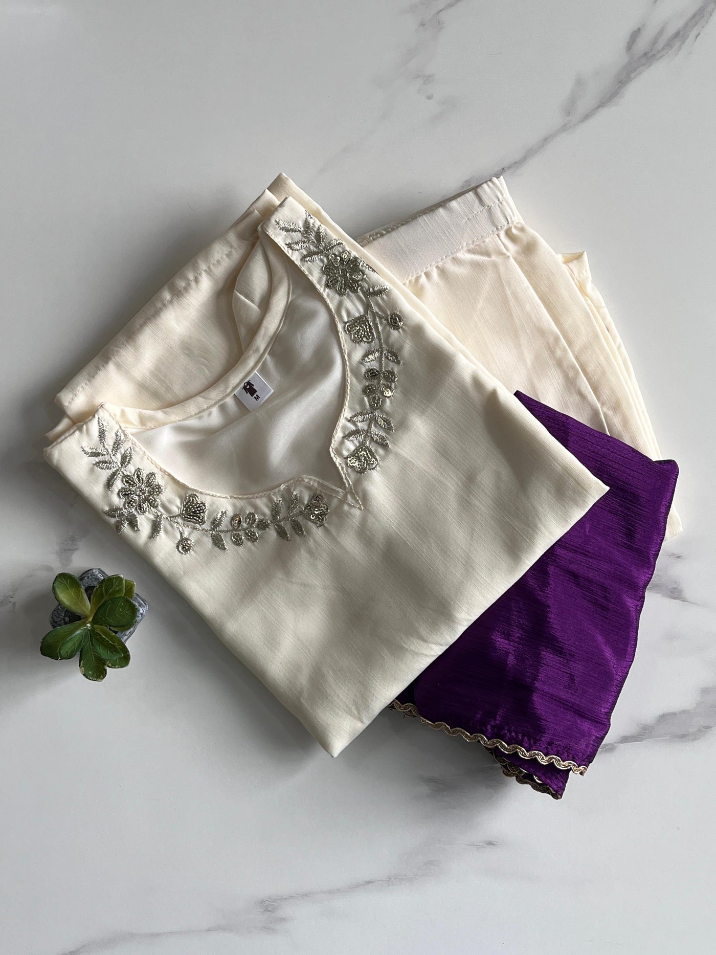 Viscose Rayon slub kurta with embroidery work on neck as shownTassels attached on sleevesPaired with viscose Rayon slub pantChinnon duppata...