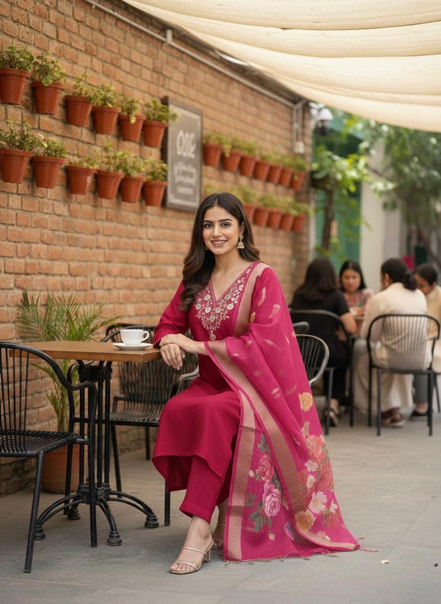 3 piece Kurti Pant Dupatta SetFABRIC Kurti:- Premium Roman Silk soft fabric with hand work neck with cotton innerSleeve length...