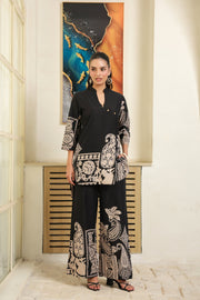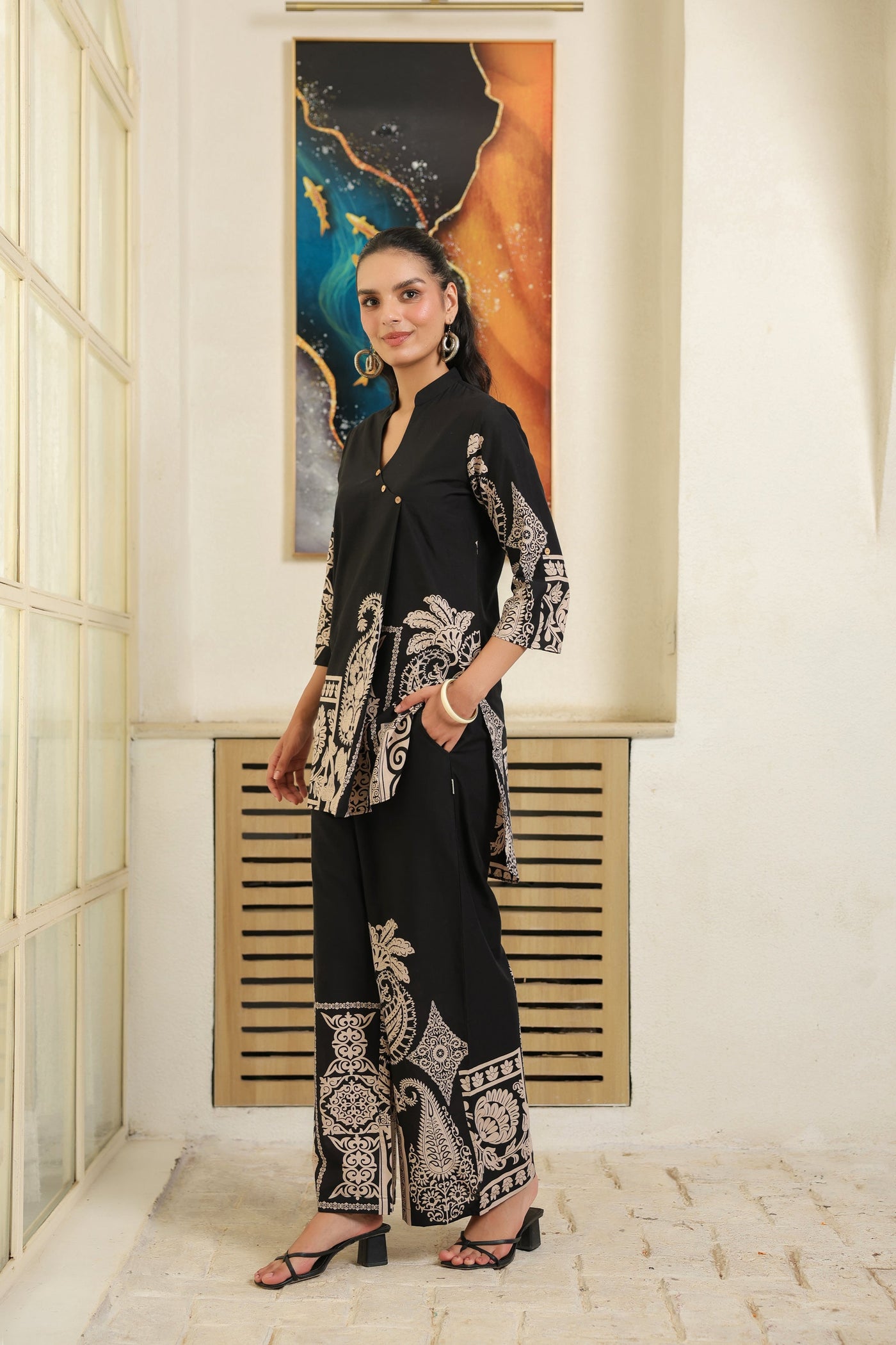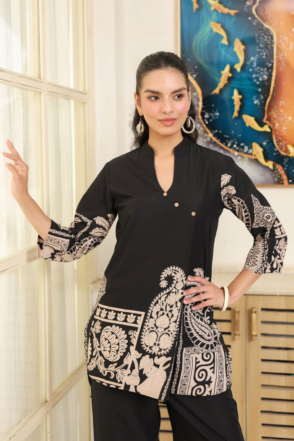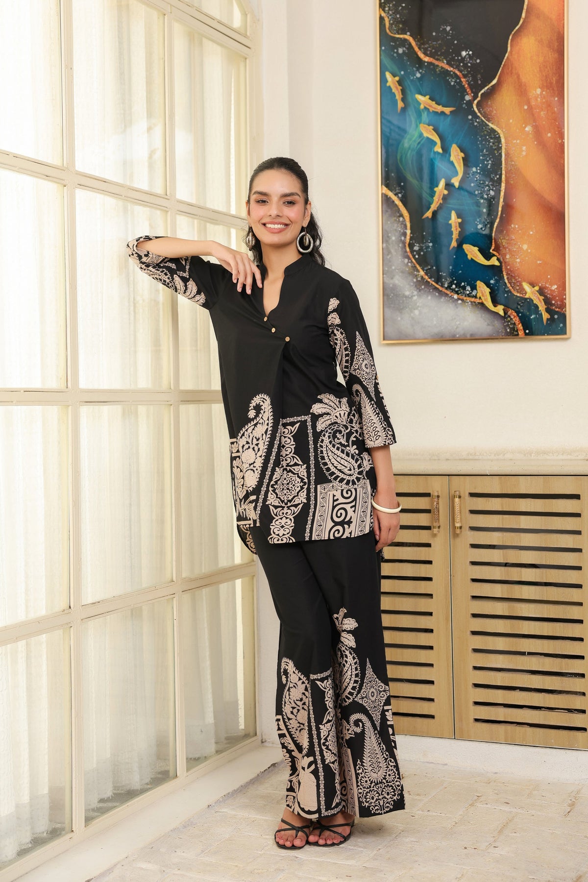 Add a dash of fun to your wardrobe with this Black Ethnic Print Cotton Co-ord Set. Made from soft, breathable...