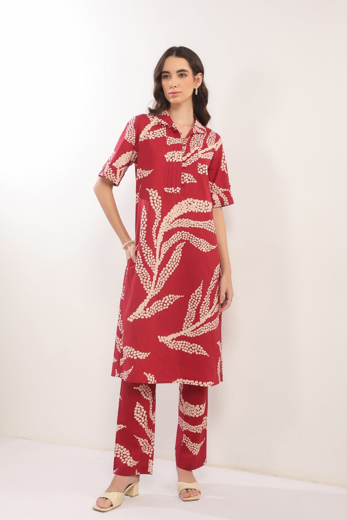Crimson Breeze Abstract Cotton Co-ord Set - S