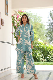 Leafy Elegance Blue Cotton Co-ord Set - S