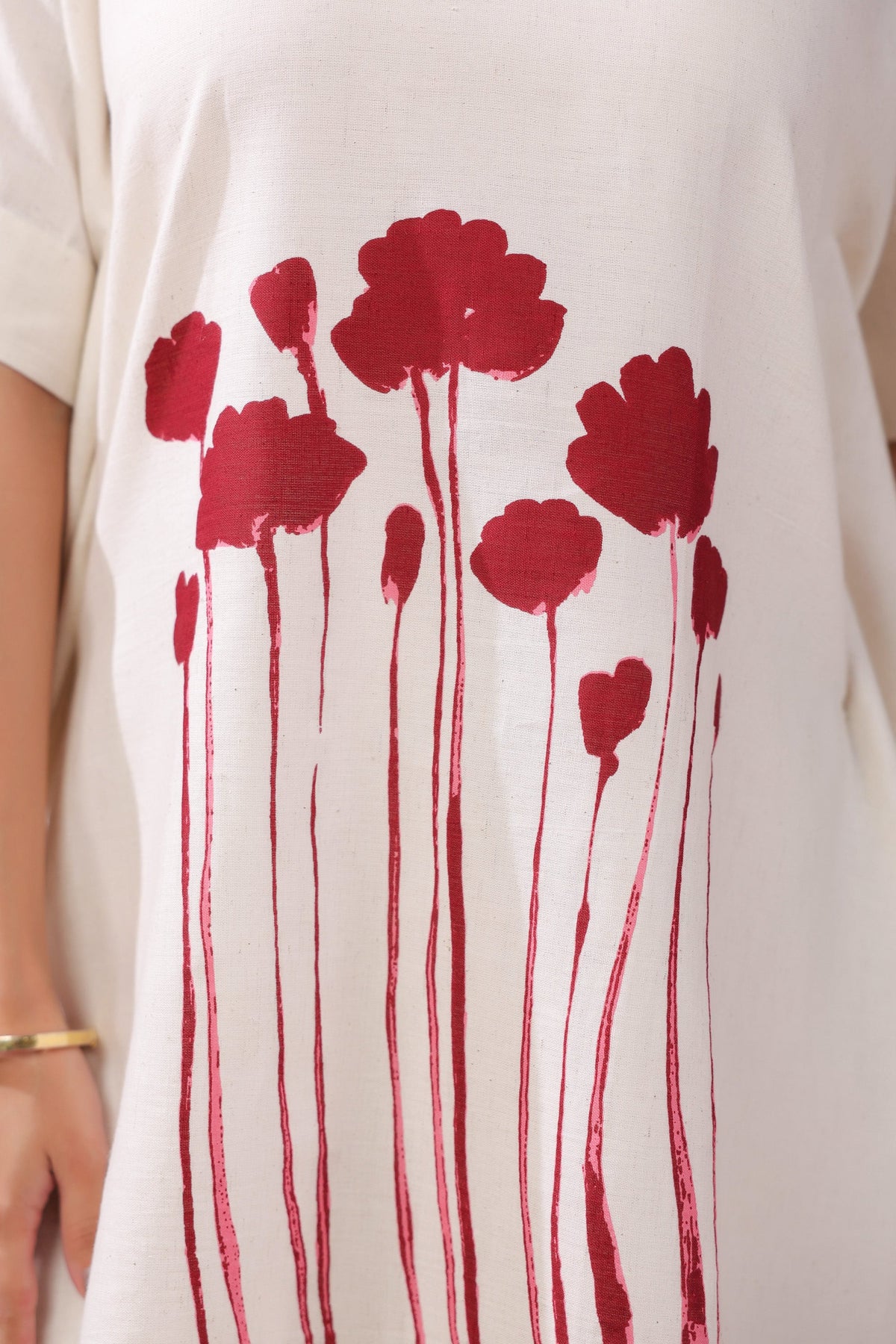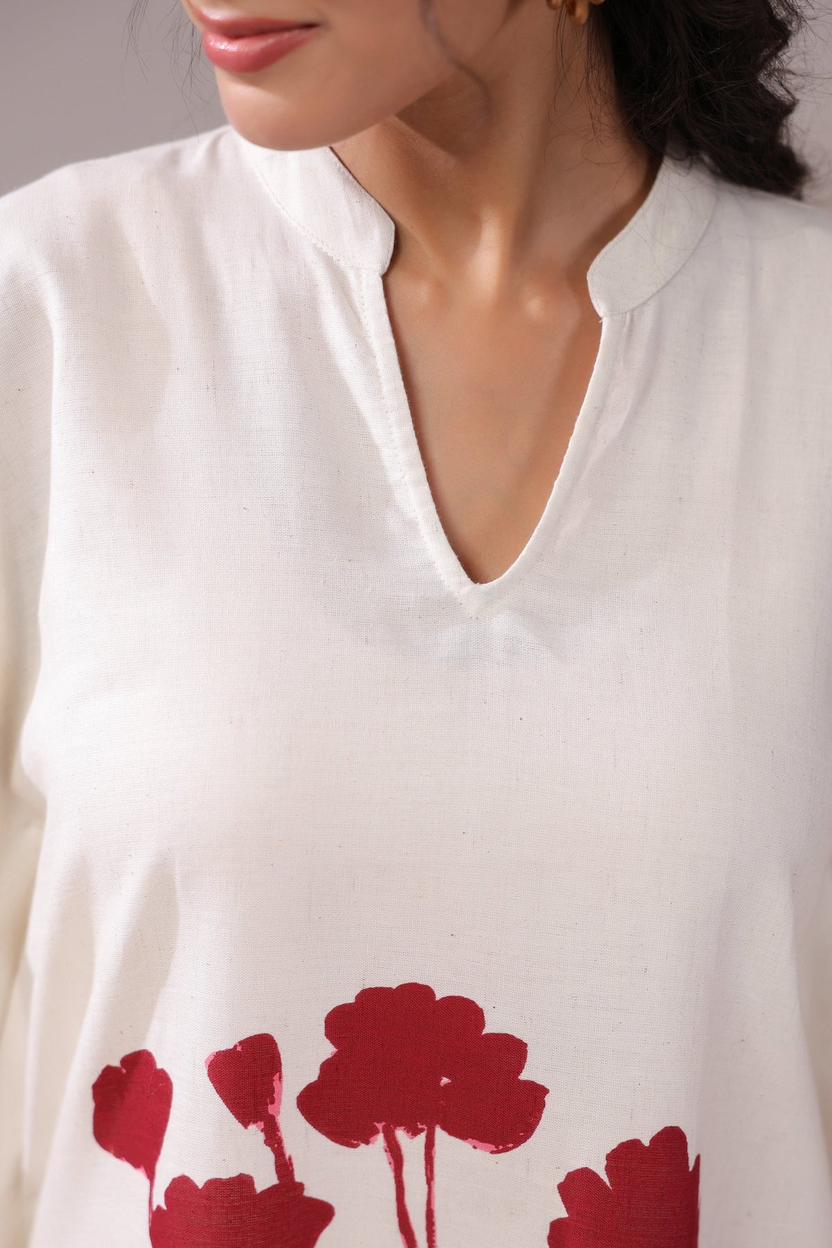 Off-White And Red Floral Print Tunic Cotton Flex Co-ord Set