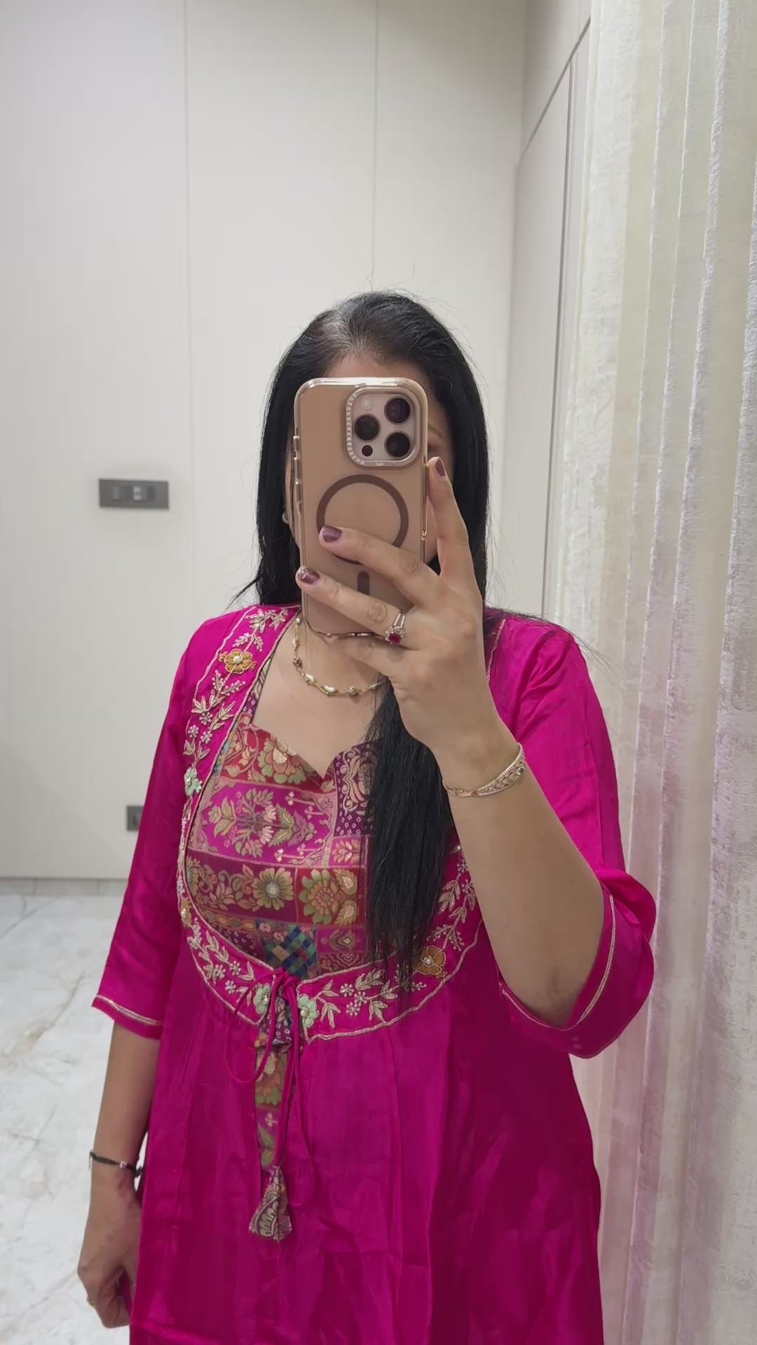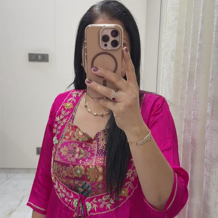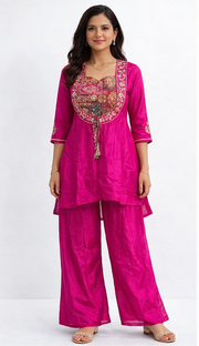 Rani Pink Pure Crape Silk Indo Western Set with Hand Work | Banarasi Jacquard Crop Top with Crape Silk Divider & Shrug | Festive & Wedding Wear - 42
