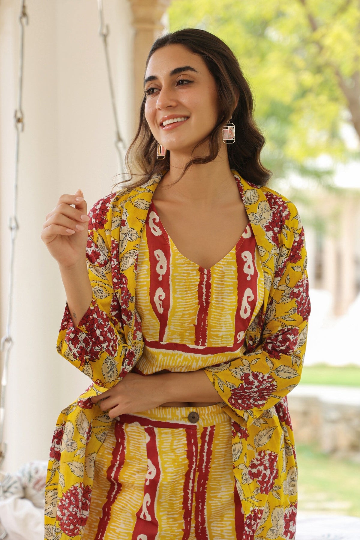 Sunburst Serenity Red And Yellow Three Piece Cotton Co-ord Set
